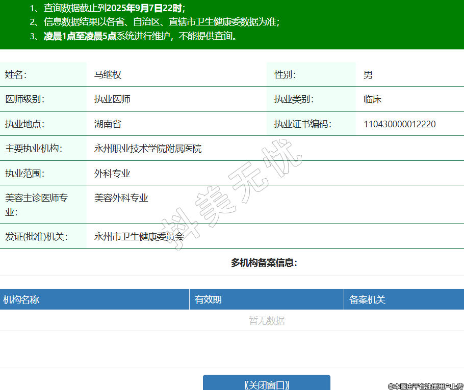 姓名:馬繼權性別:男醫(yī)師級別:執(zhí)業(yè)醫(yī)師執(zhí)業(yè)類別:臨床執(zhí)業(yè)地點:湖南省執(zhí)業(yè)證書編碼:110430000012220主要執(zhí)業(yè)機構:永州職業(yè)技術學院附屬醫(yī)院執(zhí)業(yè)范圍:外科專業(yè)美容主診醫(yī)師專業(yè):美容外科專業(yè)發(fā)證(批準)機關:永州市衛(wèi)生健康委員會 -