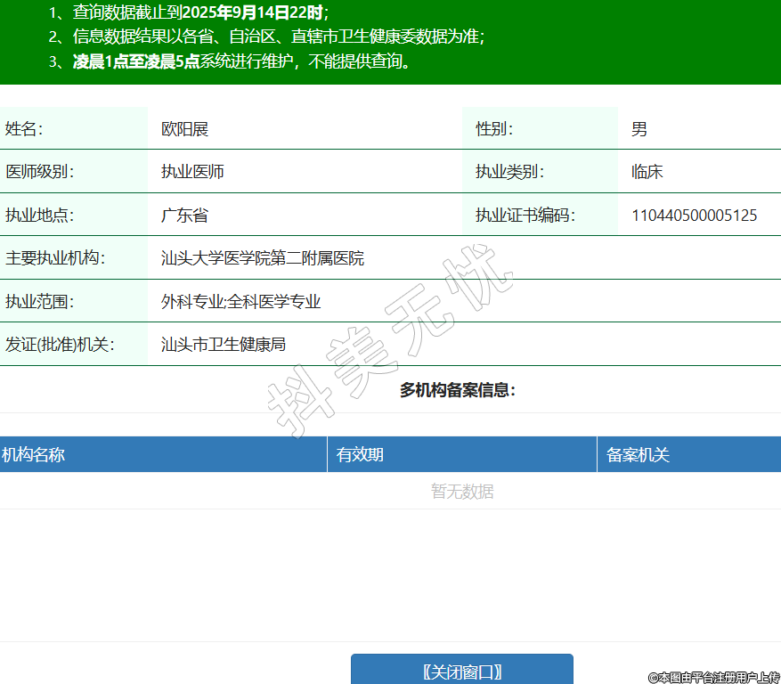 姓名:歐陽展性別:男醫(yī)師級別:執(zhí)業(yè)醫(yī)師執(zhí)業(yè)類別:臨床執(zhí)業(yè)地點(diǎn):廣東省執(zhí)業(yè)證書編碼:110440500005125主要執(zhí)業(yè)機(jī)構(gòu):汕頭大學(xué)醫(yī)學(xué)院第二附屬醫(yī)院執(zhí)業(yè)范圍:外科專業(yè);全科醫(yī)學(xué)專業(yè)發(fā)證(批準(zhǔn))機(jī)關(guān):汕頭市衛(wèi)生健康局 -