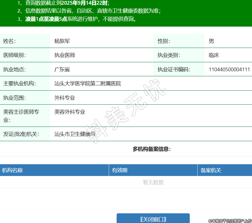 姓名:楊旅軍性別:男醫(yī)師級(jí)別:執(zhí)業(yè)醫(yī)師執(zhí)業(yè)類別:臨床執(zhí)業(yè)地點(diǎn):廣東省執(zhí)業(yè)證書編碼:110440500004111主要執(zhí)業(yè)機(jī)構(gòu):汕頭大學(xué)醫(yī)學(xué)院第二附屬醫(yī)院執(zhí)業(yè)范圍:外科專業(yè)美容主診醫(yī)師專業(yè):美容外科專業(yè)發(fā)證(批準(zhǔn))機(jī)關(guān):汕頭市衛(wèi)生健康局 -