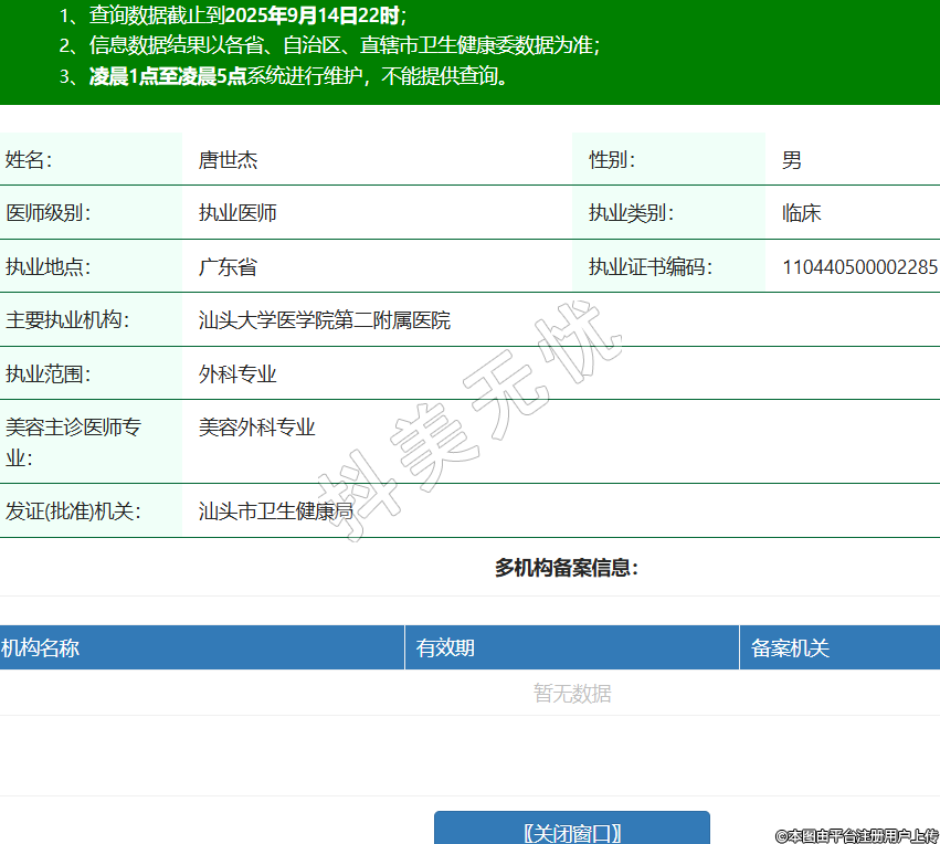姓名:唐世杰性別:男醫(yī)師級(jí)別:執(zhí)業(yè)醫(yī)師執(zhí)業(yè)類別:臨床執(zhí)業(yè)地點(diǎn):廣東省執(zhí)業(yè)證書編碼:110440500002285主要執(zhí)業(yè)機(jī)構(gòu):汕頭大學(xué)醫(yī)學(xué)院第二附屬醫(yī)院執(zhí)業(yè)范圍:外科專業(yè)美容主診醫(yī)師專業(yè):美容外科專業(yè)發(fā)證(批準(zhǔn))機(jī)關(guān):汕頭市衛(wèi)生健康局 -