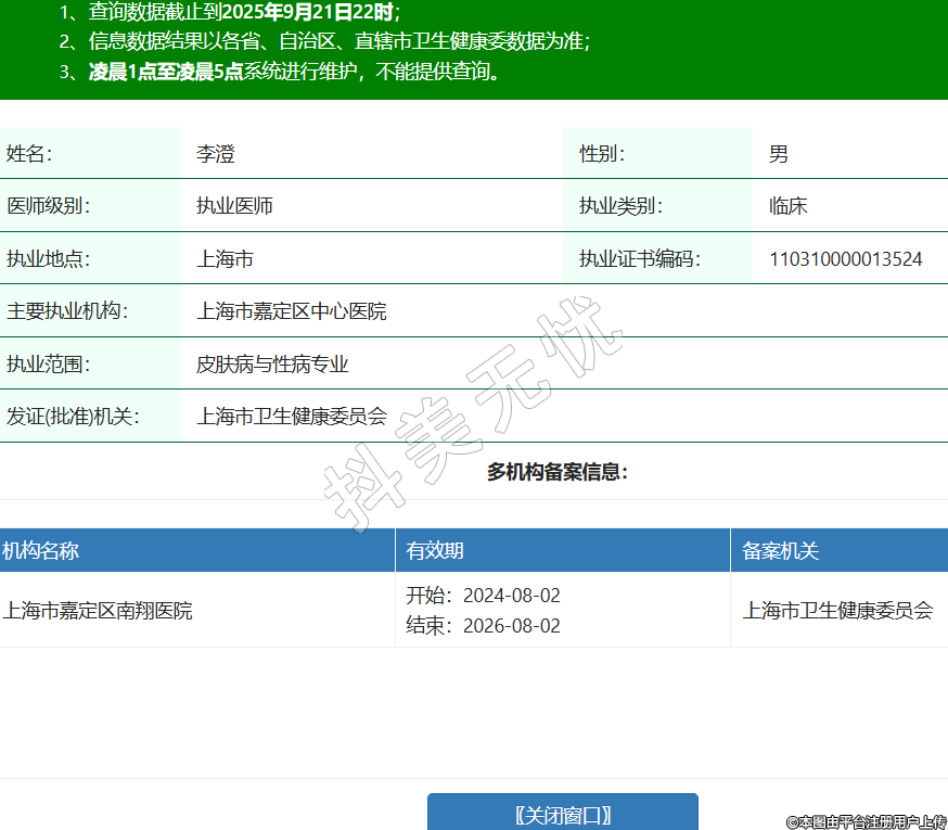 姓名:李澄性別:男醫(yī)師級別:執(zhí)業(yè)醫(yī)師執(zhí)業(yè)類別:臨床執(zhí)業(yè)地點:上海市執(zhí)業(yè)證書編碼:110310000013524主要執(zhí)業(yè)機構(gòu):上海市嘉定區(qū)中心醫(yī)院執(zhí)業(yè)范圍:皮膚病與性病專業(yè)發(fā)證(批準(zhǔn))機關(guān):上海市衛(wèi)生健康委員會多機構(gòu)備案信息:機構(gòu)名稱 有效期 備案機關(guān) 上海市嘉定區(qū)南翔醫(yī)院 開始:2024-08-02結(jié)束:2026-08-02上海市衛(wèi)生健康委員會 -