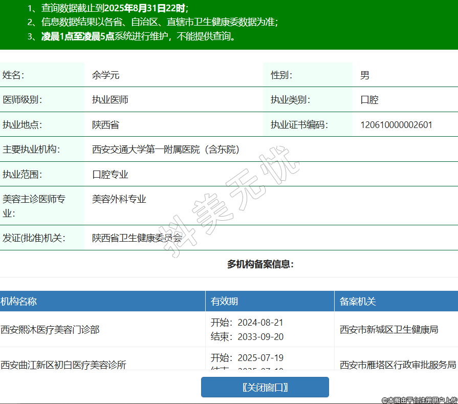 姓名:余學(xué)元性別:男醫(yī)師級別:執(zhí)業(yè)醫(yī)師執(zhí)業(yè)類別:口腔執(zhí)業(yè)地點:陜西省執(zhí)業(yè)證書編碼:120610000002601主要執(zhí)業(yè)機(jī)構(gòu):西安交通大學(xué)第一附屬醫(yī)院(含東院)執(zhí)業(yè)范圍:口腔專業(yè)美容主診醫(yī)師專業(yè):美容外科專業(yè)發(fā)證(批準(zhǔn))機(jī)關(guān):陜西省衛(wèi)生健康委員會多機(jī)構(gòu)備案信息:機(jī)構(gòu)名稱 有效期 備案機(jī)關(guān) 西安熙沐醫(yī)療美容門診部 開始:2024-08-21結(jié)束:2033-09-20西安市新城區(qū)衛(wèi)生健康局 西安曲江新區(qū)初白醫(yī)療美容診所 開始:2025-07-19結(jié)束:2035-07-18西安市雁塔區(qū)行政審批服務(wù)局 -