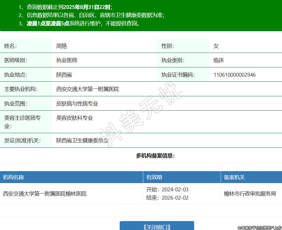 姓名:周艷性別:女醫(yī)師級別:執(zhí)業(yè)醫(yī)師執(zhí)業(yè)類別:臨床執(zhí)業(yè)地點(diǎn):陜西省執(zhí)業(yè)證書編碼:110610000002946主要執(zhí)業(yè)機(jī)構(gòu):西安交通大學(xué)第一附屬醫(yī)院執(zhí)業(yè)范圍:皮膚病與性病專業(yè)美容主診醫(yī)師專業(yè):美容皮膚科專業(yè)發(fā)證(批準(zhǔn))機(jī)關(guān):陜西省衛(wèi)生健康委員會(huì)多機(jī)構(gòu)備案信息:機(jī)構(gòu)名稱 有效期 備案機(jī)關(guān) 西安交通大學(xué)第一附屬醫(yī)院榆林醫(yī)院 開始:2024-02-03結(jié)束:2026-02-02榆林市行政審批服務(wù)局 -