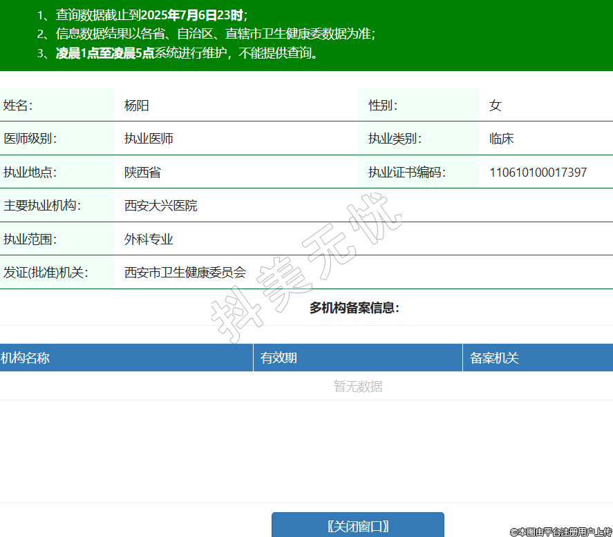 姓名:楊陽性別:女醫(yī)師級別:執(zhí)業(yè)醫(yī)師執(zhí)業(yè)類別:臨床執(zhí)業(yè)地點:陜西省執(zhí)業(yè)證書編碼:110610100017397主要執(zhí)業(yè)機構(gòu):西安大興醫(yī)院執(zhí)業(yè)范圍:外科專業(yè)發(fā)證(批準)機關(guān):西安市衛(wèi)生健康委員會 -