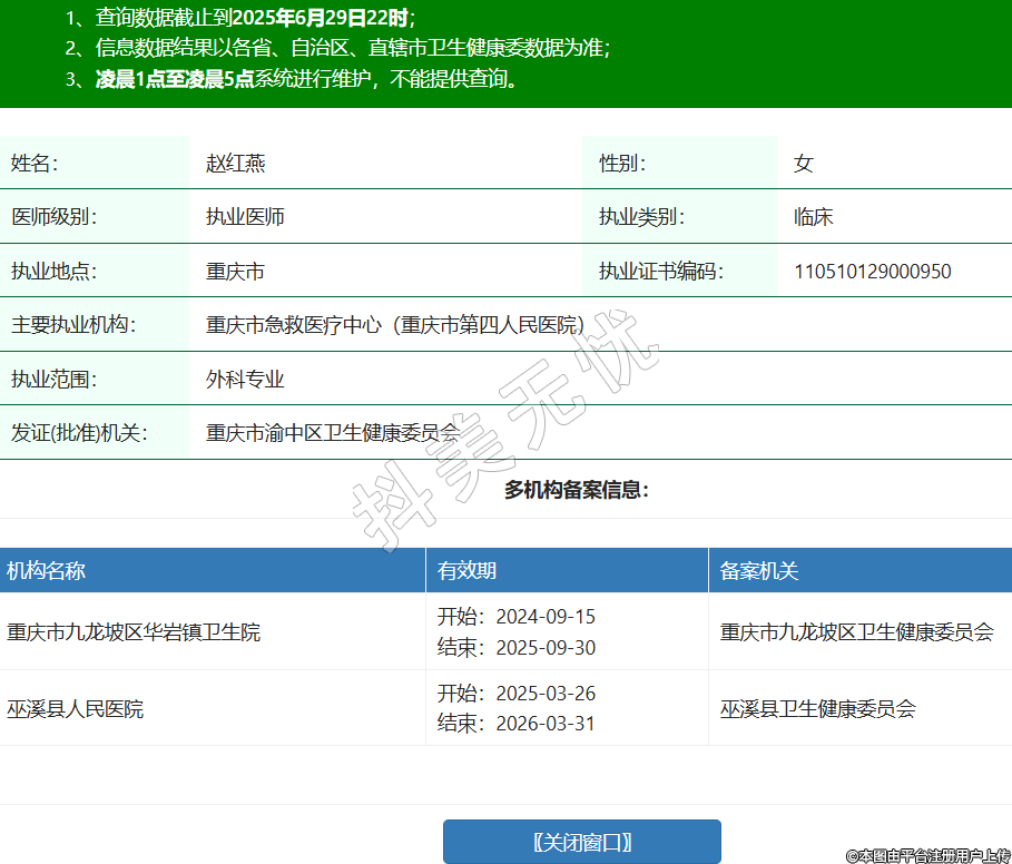 姓名:趙紅燕性別:女醫(yī)師級別:執(zhí)業(yè)醫(yī)師執(zhí)業(yè)類別:臨床執(zhí)業(yè)地點:重慶市執(zhí)業(yè)證書編碼:110510129000950主要執(zhí)業(yè)機構(gòu):重慶市急救醫(yī)療中心(重慶市第四人民醫(yī)院)執(zhí)業(yè)范圍:外科專業(yè)發(fā)證(批準)機關(guān):重慶市渝中區(qū)衛(wèi)生健康委員會多機構(gòu)備案信息:機構(gòu)名稱 有效期 備案機關(guān) 重慶市九龍坡區(qū)華巖鎮(zhèn)衛(wèi)生院 開始:2024-09-15結(jié)束:2025-09-30重慶市九龍坡區(qū)衛(wèi)生健康委員會 巫溪縣人民醫(yī)院 開始:2025-03-26結(jié)束:2026-03-31巫溪縣衛(wèi)生健康委員會 -