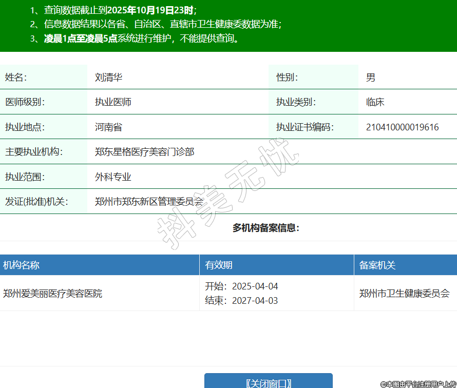 姓名:劉清華性別:男醫(yī)師級別:執(zhí)業(yè)醫(yī)師執(zhí)業(yè)類別:臨床執(zhí)業(yè)地點:河南省執(zhí)業(yè)證書編碼:210410000019616主要執(zhí)業(yè)機構(gòu):鄭東星格醫(yī)療美容門診部執(zhí)業(yè)范圍:外科專業(yè)發(fā)證(批準)機關(guān):鄭州市鄭東新區(qū)管理委員會多機構(gòu)備案信息:機構(gòu)名稱 有效期 備案機關(guān) 鄭州愛美麗醫(yī)療美容醫(yī)院 開始:2025-04-04結(jié)束:2027-04-03鄭州市衛(wèi)生健康委員會 -