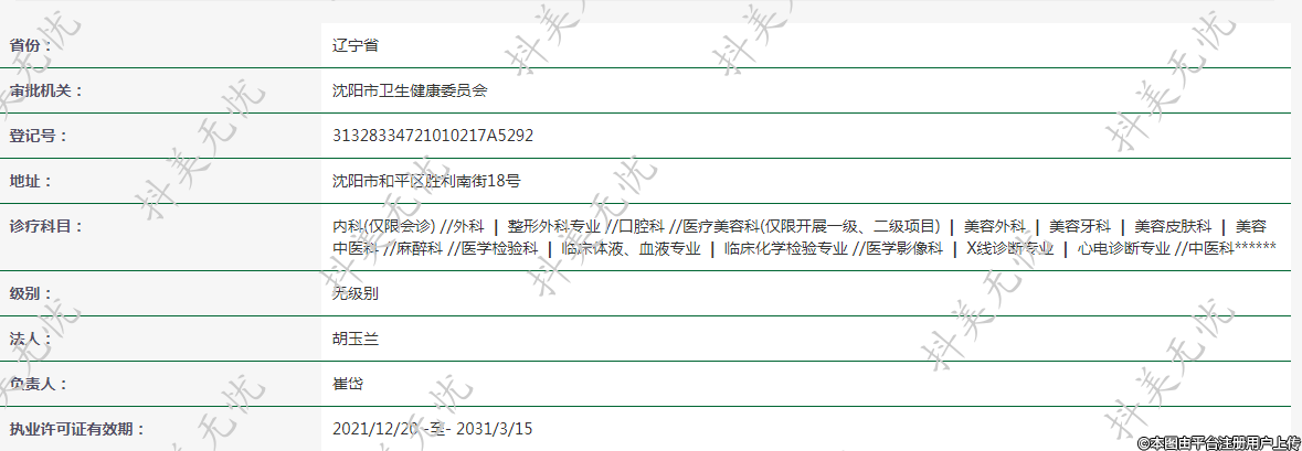 診療科目: 內(nèi)科(僅限會(huì)診) //外科 | 整形外科專(zhuān)業(yè) //口腔科 //醫(yī)療美容科(僅限開(kāi)展一級(jí)、二級(jí)項(xiàng)目) | 美容外科 | 美容牙科 | 美容皮膚科 | 美容中醫(yī)科 //麻醉科 //醫(yī)學(xué)檢驗(yàn)科 | 臨床體液、血液專(zhuān)業(yè) | 臨床化學(xué)檢驗(yàn)專(zhuān)業(yè) //醫(yī)學(xué)影像科 | X線診斷專(zhuān)業(yè) | 心電診斷專(zhuān)業(yè) //中醫(yī)科******