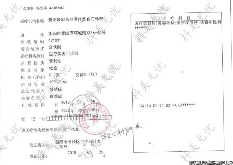 醫(yī)療機(jī)構(gòu)名稱:衡陽曹家易麗醫(yī)療美容門診部