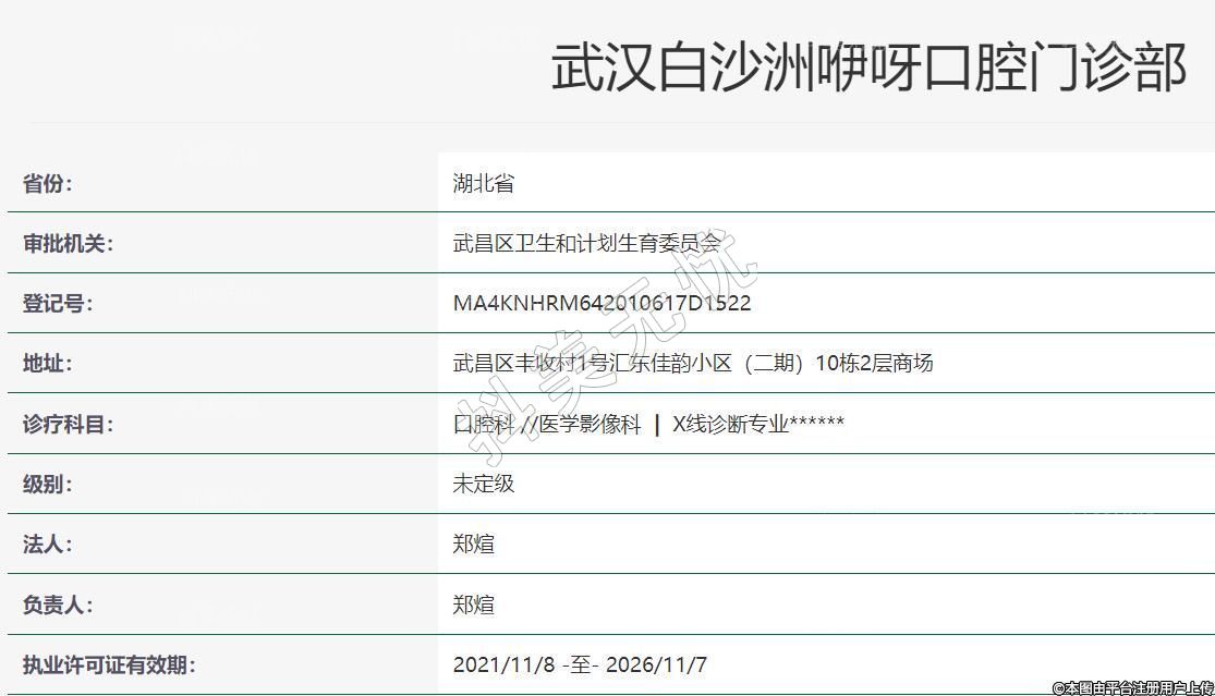 武漢咿呀口腔成立于2018-01-17,機構(gòu)位于武昌區(qū)豐收村1號匯東佳韻小區(qū)(二期)10棟2層商場,診療科目:口腔科 //醫(yī)學(xué)影像科 | X線診斷專業(yè)******