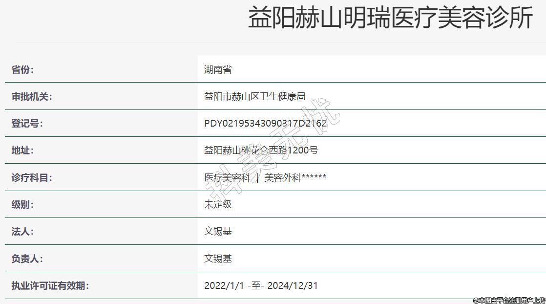 益陽赫山明瑞醫(yī)療美容2016-03-16成立,地址:益陽赫山桃花侖西路1200號,診療科目:醫(yī)療美容科 | 美容外科******