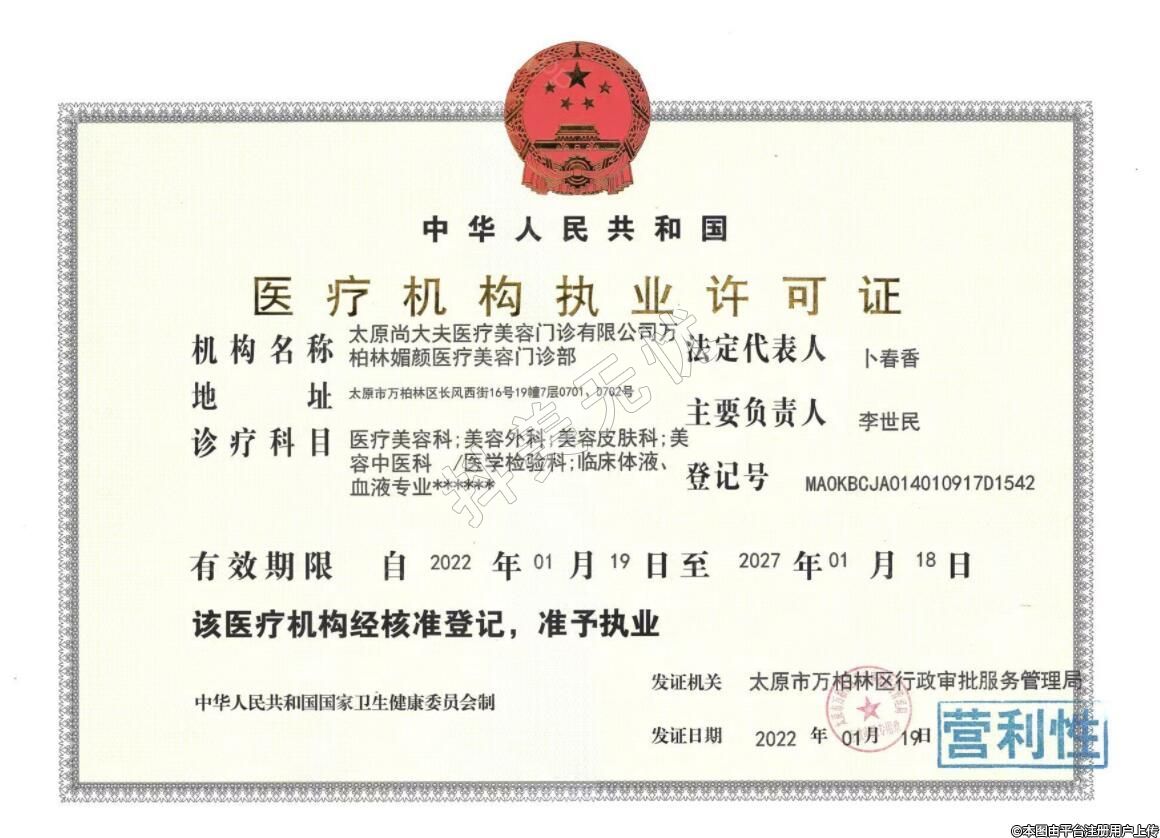 機構(gòu)名稱:太原尚大天醫(yī)療美容門診部有限公司萬柏林媚顏醫(yī)療美容門診部