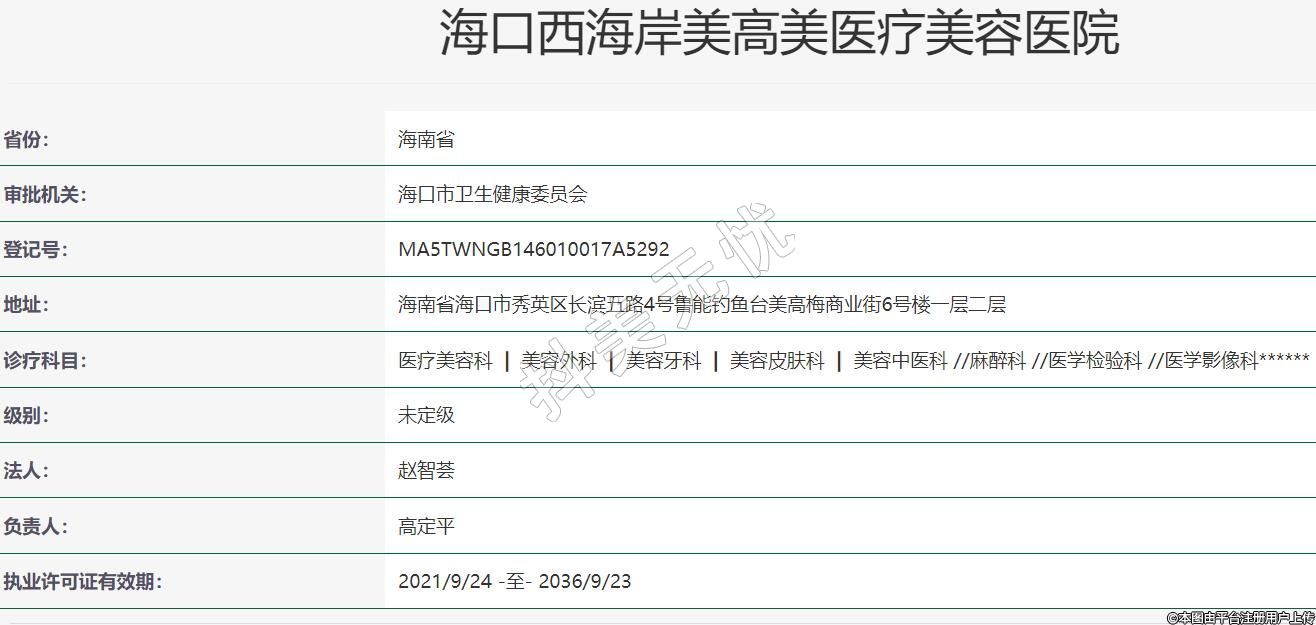 ??谖骱0睹栏呙泪t(yī)療美容2021-03-12成立,海口市秀英區(qū)長濱五路4號魯能釣魚臺美高梅商業(yè)街6號樓一層二層,診療科目:醫(yī)療美容科 | 美容外科 | 美容牙科 | 美容皮膚科 | 美容中醫(yī)科 //麻醉科 //醫(yī)學(xué)檢驗(yàn)科 //醫(yī)學(xué)影像科******