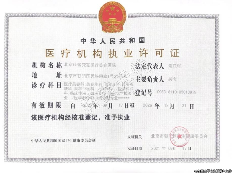 北京玲瓏梵宮醫(yī)療美容2016-01-07成立,診療科目:醫(yī)療美容科 | 美容外科 | 美容牙科 | 美容皮膚科 | 美容中醫(yī)科 //麻醉科 //醫(yī)學檢驗科 | 臨床體液、血液專業(yè) | 臨床化學檢驗專業(yè) //醫(yī)學影像科 | X線診斷專業(yè)******