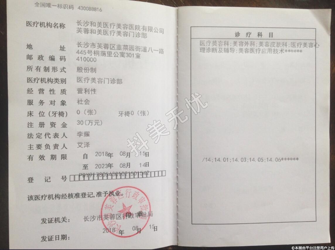 醫(yī)療機構(gòu)名稱:長沙和美醫(yī)療美容醫(yī)院有限公司芙蓉和美醫(yī)療美容門診部