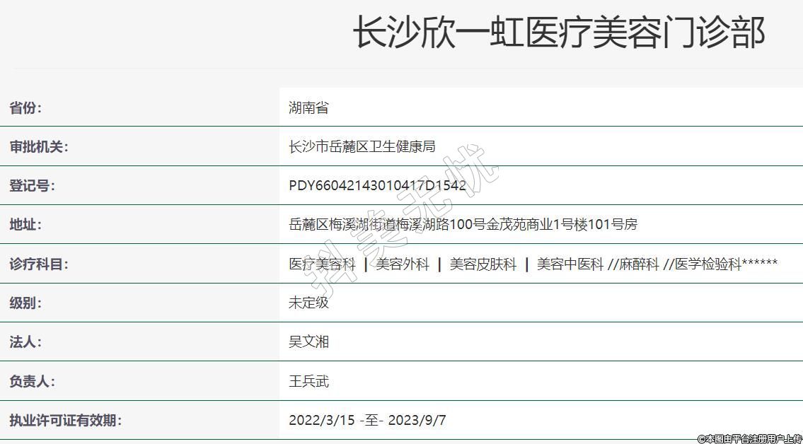 長沙欣一虹醫(yī)療美容(原名:芯美昕),2015年04月22日成立,診療科目:醫(yī)療美容科 | 美容外科 | 美容皮膚科 | 美容中醫(yī)科 //麻醉科 //醫(yī)學檢驗科******