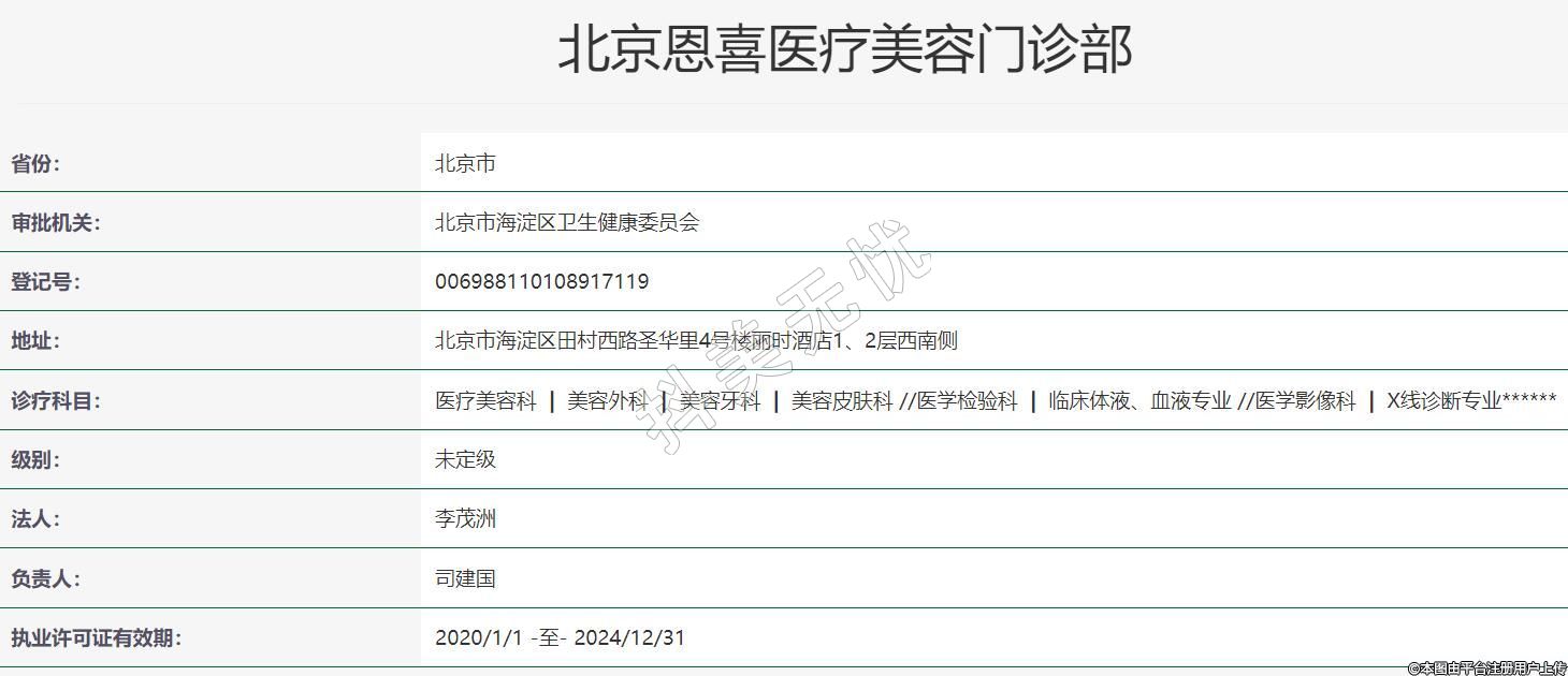 北京恩喜醫(yī)療美容2015-12-17成立,地址:北京市海淀區(qū)田村西路圣華里4號樓麗時(shí)酒店1、2層西南側(cè),診療科目:醫(yī)療美容科 | 美容外科 | 美容牙科 | 美容皮膚科 //醫(yī)學(xué)檢驗(yàn)科 | 臨床體液、血液專業(yè) //醫(yī)學(xué)影像科 | X線診斷專業(yè)******