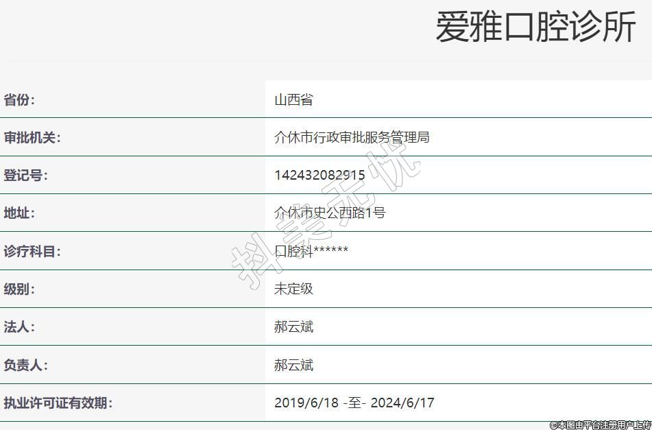 介休愛雅口腔2019年07月05日成立,地址:介休市史公西路1號,診療科目:口腔科******