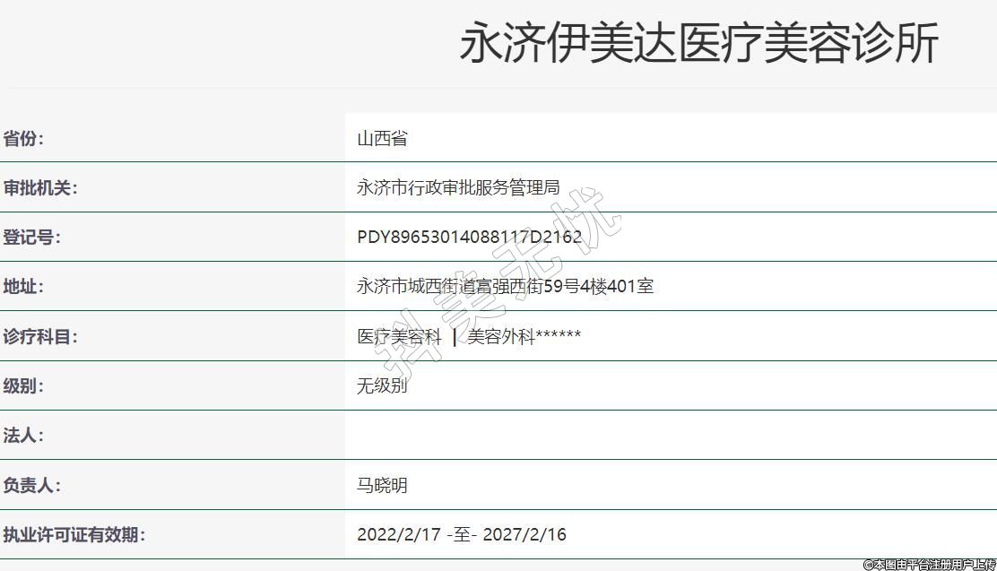 永濟(jì)伊美達(dá)醫(yī)療美容2021年11月11日成立,地址:永濟(jì)市城西街道富強(qiáng)西街59號4樓401室,診療科目:醫(yī)療美容科 | 美容外科******