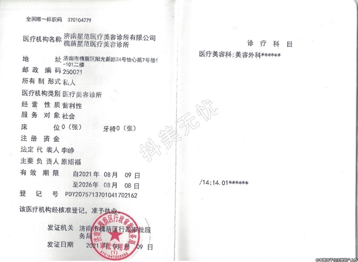 醫(yī)療機(jī)構(gòu)名稱:濟(jì)南星范醫(yī)療美容診所有限公司槐蔭星范醫(yī)療美容診所