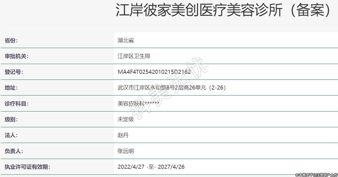 武漢彼家美創(chuàng)醫(yī)療美容2021年11月19日成立,地址:武漢市江岸區(qū)永和路8號2層商26單元(2-26),診療科目:美容皮膚科******