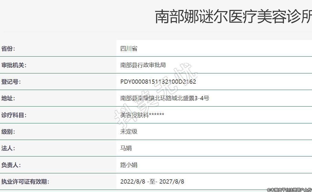 南部娜謎爾醫(yī)療美容2022-07-01成立,地址:南部縣南隆鎮(zhèn)北環(huán)路城北盛景3-4號(hào),診療科目:美容皮膚科******