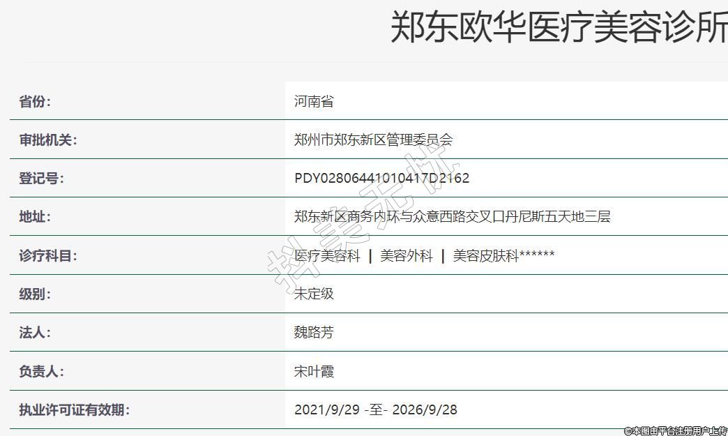 鄭東歐華醫(yī)療美容2019年10月28日成立,地址:鄭東新區(qū)商務(wù)內(nèi)環(huán)與眾意西路交叉口丹尼斯五天地三層,診療科目:醫(yī)療美容科 | 美容外科 | 美容皮膚科******
