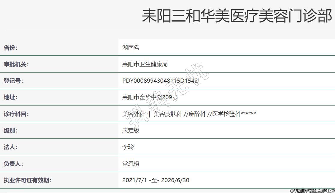 耒陽三和華美醫(yī)療美容2017年04月14日成立,地址:耒陽市金華中路209號,診療科目:美容外科 | 美容皮膚科 //麻醉科 //醫(yī)學(xué)檢驗科******