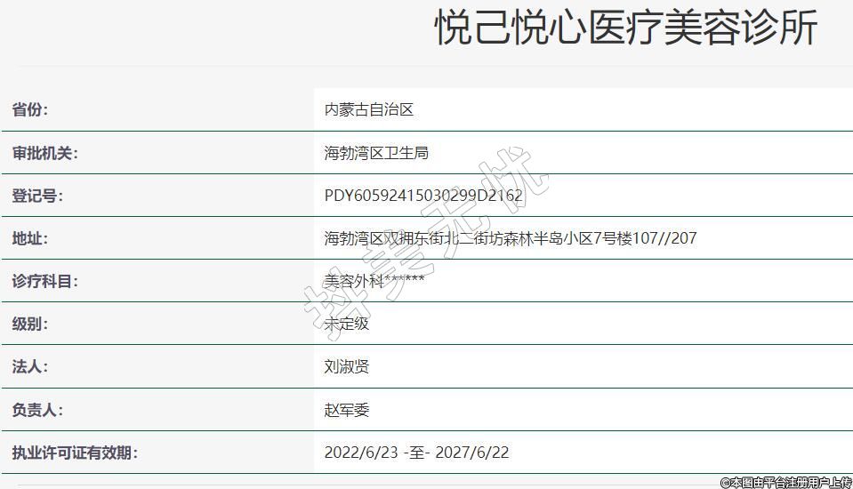 烏海市悅己悅心醫(yī)療美容有限公司,成立于2020-09-25,位于內(nèi)蒙古自治區(qū)烏海市海勃灣區(qū)雙擁東街北二街坊森林半島小區(qū)7號(hào)樓107//207。