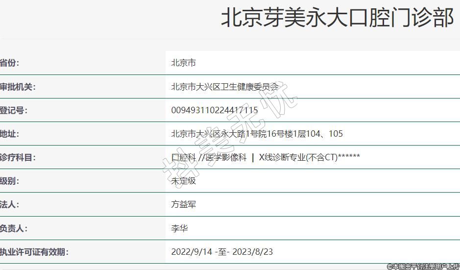 北京芽美永大口腔2017-10-12成立,地址:北京市大興區(qū)永大路1號院16號樓1層104、105,診療科目:口腔科 //醫(yī)學(xué)影像科 | X線診斷專業(yè)(不含CT)******