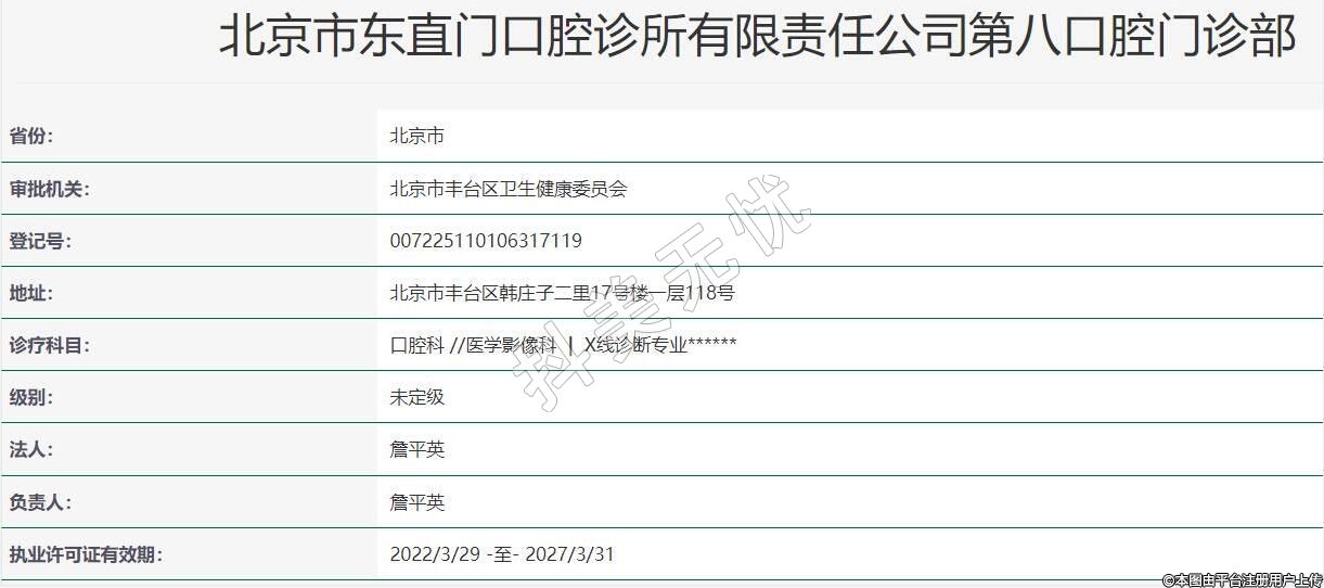 北京東直門口腔(第八口腔)2021-12-20成立,地址:北京市豐臺區(qū)韓莊子二里17號樓一層118號,診療科目:口腔科 //醫(yī)學影像科 | X線診斷專業(yè)******