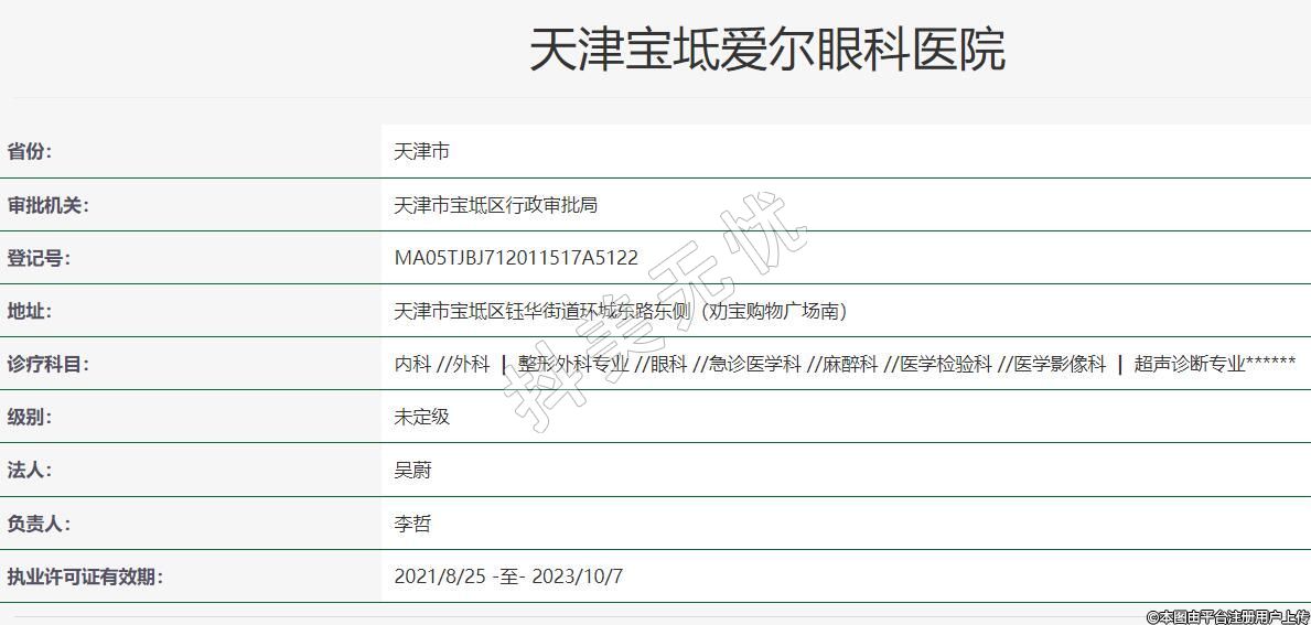 天津?qū)氎鎼蹱栄劭?017-07-12成立,診療科目:內(nèi)科 //外科 | 整形外科專業(yè) //眼科 //急診醫(yī)學科 //麻醉科 //醫(yī)學檢驗科 //醫(yī)學影像科 | 超聲診斷專業(yè)******