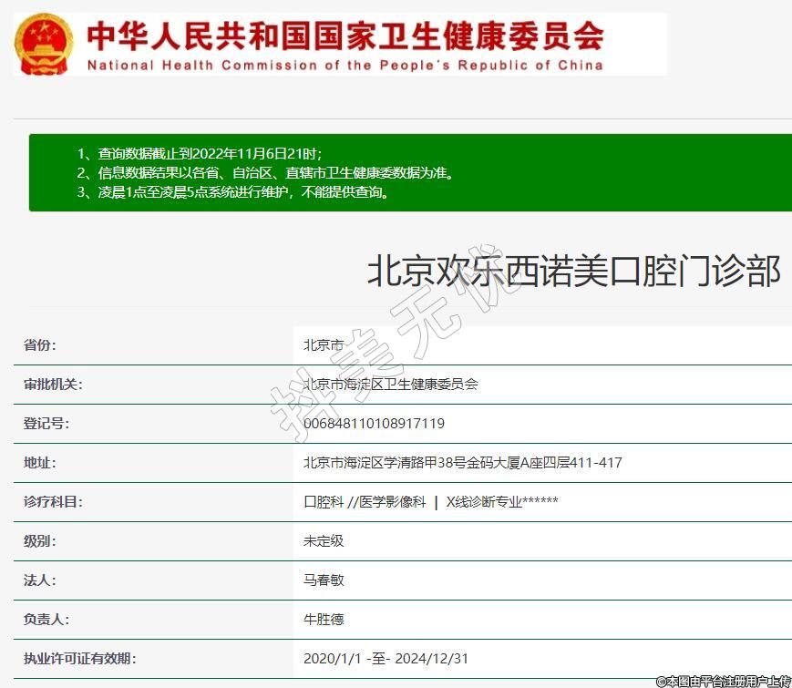 北京歡樂西諾美口腔2015-12-24成立,地址:北京市海淀區(qū)學清路甲38號金碼大廈A座四層411-417,診療科目:口腔科 //醫(yī)學影像科 | X線診斷專業(yè)******