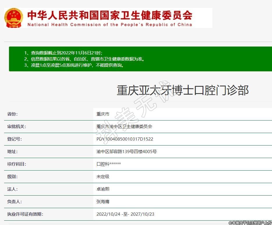 重慶亞太牙博士口腔2018-07-23,地址:渝中區(qū)鄒容路139號四樓4005號,診療科目:口腔科******