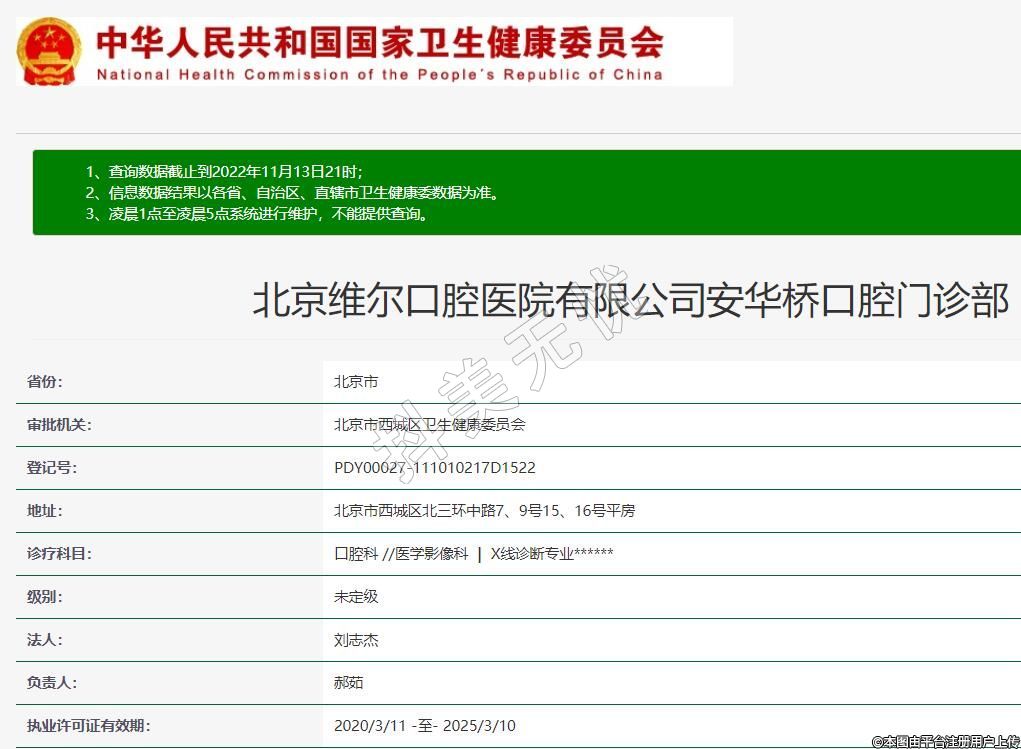 北京維爾口腔(西城分院)2015-07-13成立,地址:北京市西城區(qū)北三環(huán)中路7、9號15、16號平房,診療科目:口腔科 //醫(yī)學影像科 | X線診斷專業(yè)******