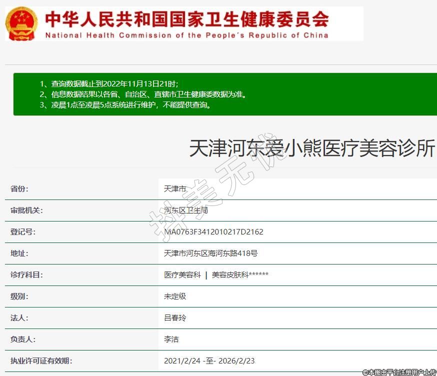 天津愛小熊醫(yī)療美容2020-11-04成立,地址:天津市河?xùn)|區(qū)海河?xùn)|路418號,診療科目:醫(yī)療美容科 | 美容皮膚科******