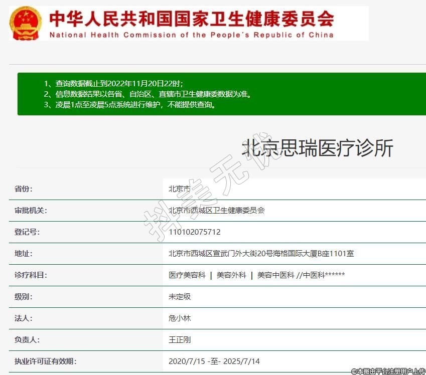 北京思瑞醫(yī)療美容2007-03-21成立,地址:北京市西城區(qū)宣武門外大街20號海格國際大廈B座1101室,診療科目:醫(yī)療美容科 | 美容外科 | 美容中醫(yī)科 //中醫(yī)科******