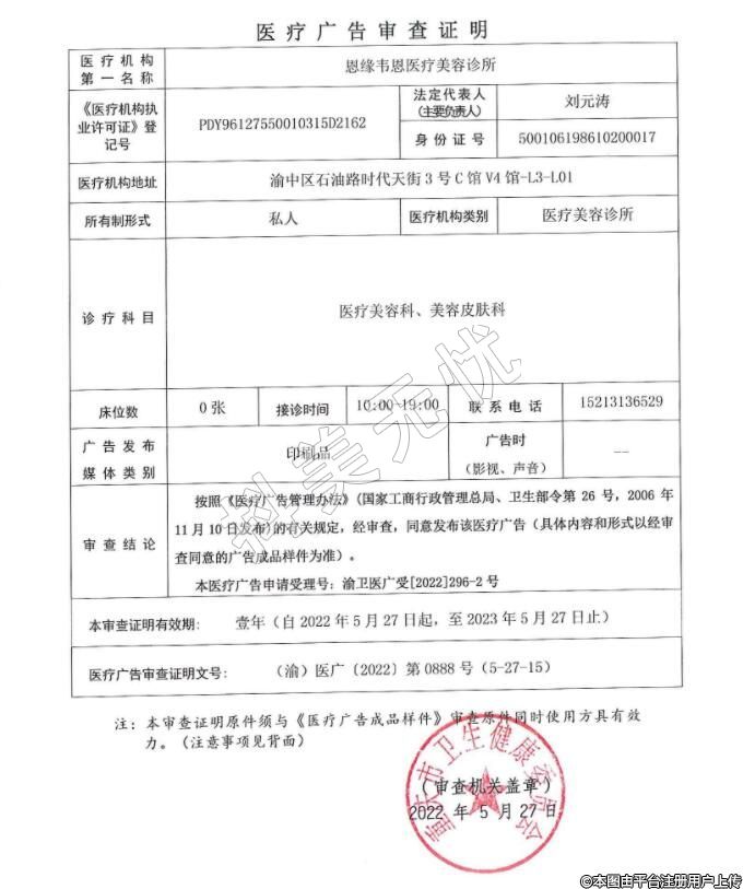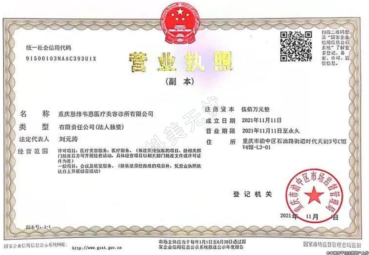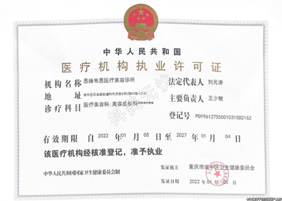 重慶恩緣韋恩醫(yī)療美容2021-11-11成立,地址:渝中區(qū)石油路街道時(shí)代天街3號(hào)C館V4館-L3-01,診療科目:醫(yī)療美容科 | 美容皮膚科******