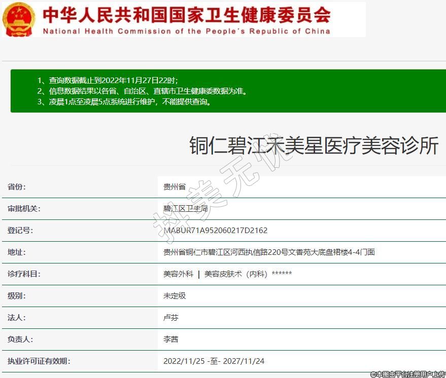 銅仁禾美星醫(yī)療美容2022-08-24成立,地址:貴州省銅仁市碧江區(qū)河西執(zhí)信路220號文香苑大底盤裙樓4-4門面,診療科目:美容外科 | 美容皮膚術(shù)(內(nèi)科)******
