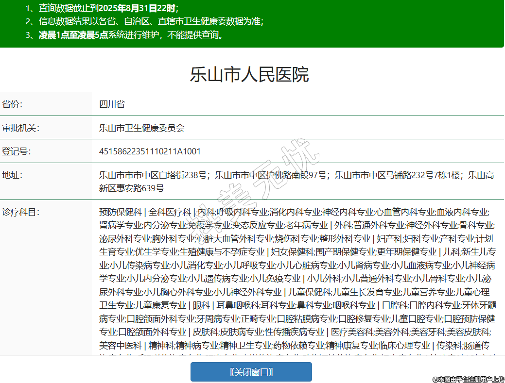 省份:四川省審批機關(guān):樂山市衛(wèi)生健康委員會登記號:45158622351110211A1001地址:樂山市市市中區(qū)白塔街238號;樂山市市中區(qū)護(hù)佛路南段97號;樂山市市中區(qū)馬鋪路232號7棟1樓;樂山高新區(qū)惠安路639號診療科目:預(yù)防保健科 | 全科醫(yī)療科 | 內(nèi)科;呼吸內(nèi)科專業(yè);消化內(nèi)科專業(yè);神經(jīng)內(nèi)科專業(yè);心血管內(nèi)科專業(yè);血液內(nèi)科專業(yè);腎病學(xué)專業(yè);內(nèi)分泌專業(yè);免疫學(xué)專業(yè);變態(tài)反應(yīng)專業(yè);老年病專業(yè) | 外科;普通外科專業(yè);神經(jīng)外科專業(yè);骨科專業(yè);泌尿外科專業(yè);胸外科專業(yè);心臟大血管外科專業(yè);燒傷科專業(yè);整形外科專業(yè) | 婦產(chǎn)科;婦科專業(yè);產(chǎn)科專業(yè);計劃生育專業(yè);優(yōu)生學(xué)專業(yè);生殖健康與不孕癥專業(yè) | 婦女保健科;圍產(chǎn)期保健專業(yè);更年期保健專業(yè) | 兒科;新生兒專業(yè);小兒傳染病專業(yè);小兒消化專業(yè);小兒呼吸專業(yè);小兒心臟病專業(yè);小兒腎病專業(yè);小兒血液病專業(yè);小兒神經(jīng)病學(xué)專業(yè);小兒內(nèi)分泌專業(yè);小兒遺傳病專業(yè);小兒免疫專業(yè) | 小兒外科;小兒普通外科專業(yè);小兒骨科專業(yè);小兒泌尿外科專業(yè);小兒胸心外科專業(yè);小兒神經(jīng)外科專業(yè) | 兒童保健科;兒童生長發(fā)育專業(yè);兒童營養(yǎng)專業(yè);兒童心理衛(wèi)生專業(yè);兒童康復(fù)專業(yè) | 眼科 | 耳鼻咽喉科;耳科專業(yè);鼻科專業(yè);咽喉科專業(yè) | 口腔科;口腔內(nèi)科專業(yè);牙體牙髓病專業(yè);口腔頜面外科專業(yè);牙周病專業(yè);正畸專業(yè);口腔粘膜病專業(yè);口腔修復(fù)專業(yè);兒童口腔專業(yè);口腔預(yù)防保健專業(yè);口腔頜面外科專業(yè) | 皮膚科;皮膚病專業(yè);性傳播疾病專業(yè) | 醫(yī)療美容科;美容外科;美容牙科;美容皮膚科;美容中醫(yī)科 | 精神科;精神病專業(yè);精神衛(wèi)生專業(yè);藥物依賴專業(yè);精神康復(fù)專業(yè);臨床心理專業(yè) | 傳染科;腸道傳染病專業(yè);呼吸道傳染病專業(yè);肝炎專業(yè);蟲媒傳染病專業(yè);動物源性傳染病專業(yè);蠕蟲病專業(yè) | 結(jié)核病科 | 腫瘤科 | 急診醫(yī)學(xué)科 | 康復(fù)醫(yī)學(xué)科 | 麻醉科 | 疼痛科 | 重癥醫(yī)學(xué)科 | 醫(yī)學(xué)檢驗科;臨床體液、血液專業(yè);臨床微生物學(xué)專業(yè);臨床化學(xué)檢驗專業(yè);臨床免疫、血清學(xué)專業(yè);臨床細(xì)胞分子遺傳學(xué)專業(yè) | 病理科 | 醫(yī)學(xué)影像科;X線診斷專業(yè);CT診斷專業(yè);磁共振成像診斷專業(yè);核醫(yī)學(xué)專業(yè);超聲診斷專業(yè);心電診斷專業(yè);腦電及腦血流圖診斷專業(yè);神經(jīng)肌肉電圖專業(yè);介入放射學(xué)專業(yè);放射治療專業(yè) | 中醫(yī)科;內(nèi)科專業(yè);外科專業(yè);婦產(chǎn)科專業(yè);兒科專業(yè);皮膚科專業(yè);眼科專業(yè);耳鼻咽喉科專業(yè);骨傷科專業(yè);肛腸科專業(yè);老年病科專業(yè);針灸科專業(yè);推拿科專業(yè);康復(fù)醫(yī)學(xué)專業(yè);預(yù)防保健科專業(yè) | 中西醫(yī)結(jié)合科******級別:三級法定代表人:曾國軍主要負(fù)責(zé)人:曾國軍執(zhí)業(yè)許可證有效期:2025/06/25 -至- 2040/02/27 -