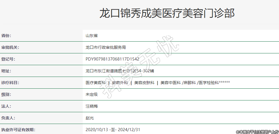 龍口錦秀成美醫(yī)療美容門診部,位于龍口市錦里七號,門診建筑面積1100余平方,是一所醫(yī)師力量較雄厚,技術(shù)水平,服務(wù)項(xiàng)目齊全,醫(yī)療設(shè)備較先進(jìn)的醫(yī)學(xué)整容美容機(jī)構(gòu),設(shè)有整形、皮膚、無創(chuàng)、中醫(yī)、私密等科室。激光室,消毒室,無菌操作手術(shù)室,觀察室等一應(yīng)齊全。
