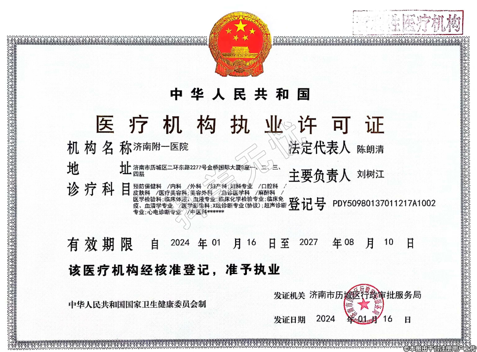濟(jì)南附一醫(yī)院成立于2022年6月9日,注冊(cè)地址位于濟(jì)南市歷城區(qū)二環(huán)東路2277號(hào)金橋國(guó)際大廈B座,初期注冊(cè)資本200萬元。醫(yī)院開設(shè)預(yù)防保健科、內(nèi)科、外科、婦產(chǎn)科、口腔科、皮膚科、醫(yī)療美容科、急診醫(yī)學(xué)科、麻醉科、醫(yī)學(xué)檢驗(yàn)科、醫(yī)學(xué)影像科、中醫(yī)科等臨床及醫(yī)技科室。2023年5月營(yíng)業(yè)面積擴(kuò)展至四個(gè)樓層,2024年1月由原名濟(jì)南艾魅麗醫(yī)院有限公司更名。作為營(yíng)利性醫(yī)療機(jī)構(gòu),其業(yè)務(wù)涵蓋醫(yī)療服務(wù)、醫(yī)療美容等核心領(lǐng)域,2025年3月完成法定代表人及股東變更。