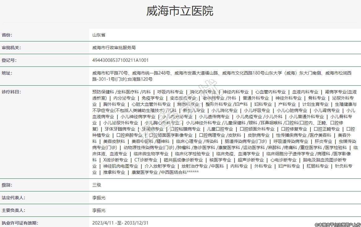 地址:威海市和平路70號、威海市統(tǒng)一路248號、威海市世昌大道福山路、威海市文化西路180號山東大學(威海)東大門南側(cè)、威海市松澗西路-301-1號(門診);臺灣路120號