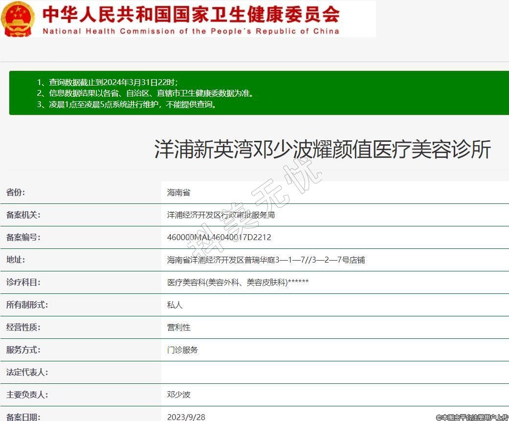 洋浦新英灣鄧少波耀顏值醫(yī)療美容診所,診療科目:醫(yī)療美容科(美容外科、美容皮膚科)******