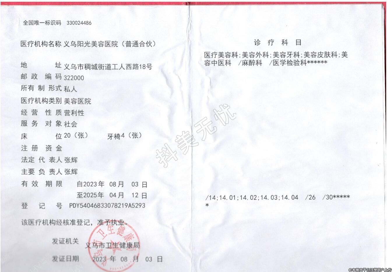 醫(yī)療機(jī)構(gòu)名稱:義烏陽(yáng)光美容醫(yī)院(普通合伙)