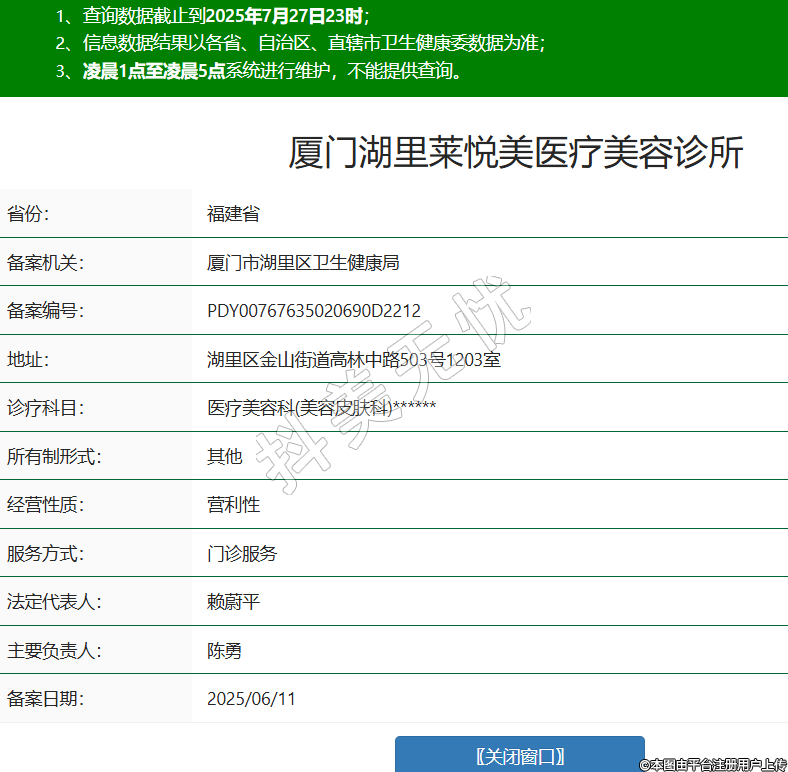 省份:福建省備案機(jī)關(guān):廈門市湖里區(qū)衛(wèi)生健康局備案編號(hào):PDY00767635020690D2212地址:湖里區(qū)金山街道高林中路503號(hào)1203室診療科目:醫(yī)療美容科(美容皮膚科)******所有制形式:其他經(jīng)營(yíng)性質(zhì):營(yíng)利性服務(wù)方式:門診服務(wù)法定代表人:賴蔚平主要負(fù)責(zé)人:陳勇備案日期:2025/06/11 -