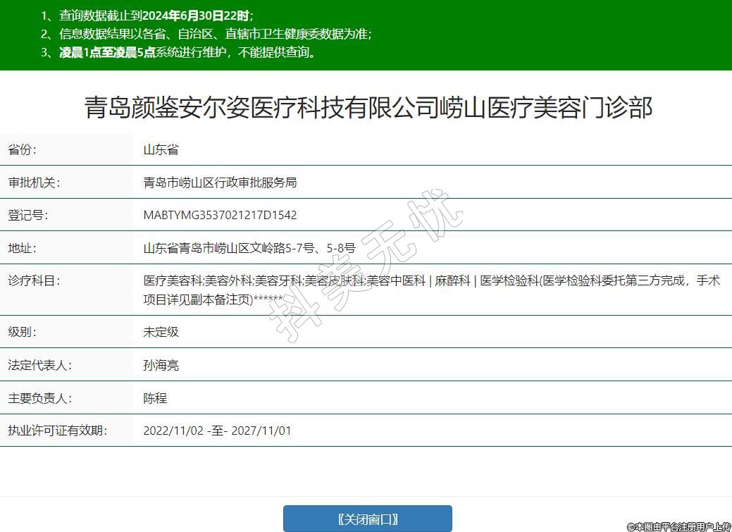青島顏鑒安爾姿醫(yī)療科技有限公司嶗山醫(yī)療美容門診部,診療科目:醫(yī)療美容科;美容外科;美容牙科;美容皮膚科;美容中醫(yī)科 | 麻醉科 | 醫(yī)學檢驗科(醫(yī)學檢驗科委托第三方完成,手術項目詳見副本備注頁)******