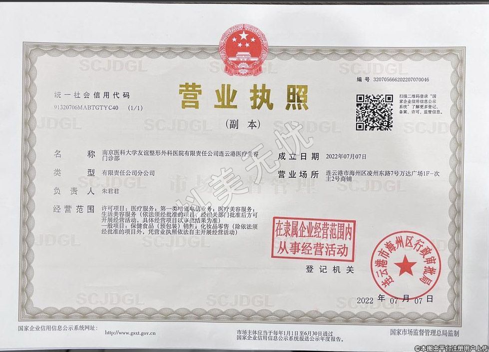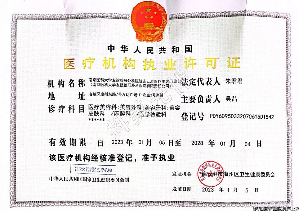 機(jī)構(gòu)名稱:南京醫(yī)科大學(xué)友誼整形外科醫(yī)院連云港醫(yī)療美容門診部(南京醫(yī)科大學(xué)友誼整形外科醫(yī)院有限責(zé)任公司)