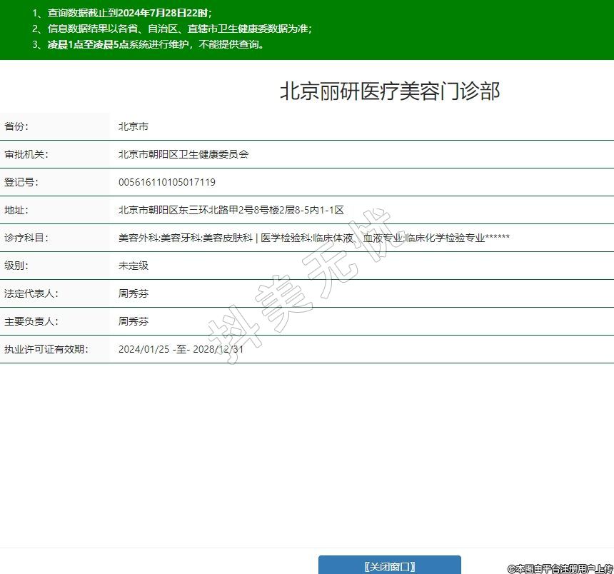 北京麗研醫(yī)療美容門診部,診療科目:美容外科;美容牙科;美容皮膚科 | 醫(yī)學檢驗科;臨床體液、血液專業(yè);臨床化學檢驗專業(yè)******