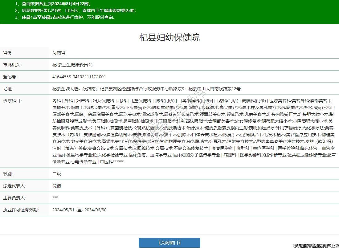 內(nèi)科 | 外科 | 婦產(chǎn)科 | 婦女保健科 | 兒科 | 兒童保健科 | 眼科(門診) | 耳鼻咽喉科(門診) | 口腔科(門診) | 皮膚科(門診) | 醫(yī)療美容科;美容外科;眉部美容術(shù);眉提升術(shù);修眉手術(shù);眼部美容術(shù);重瞼術(shù);下瞼袋矯正術(shù);眼瞼其他美容術(shù);鼻部美容術(shù);隆鼻術(shù);鼻尖美容術(shù);鼻小柱及鼻孔美容術(shù);耳廓美容術(shù);招風(fēng)耳矯正術(shù);口唇部美容術(shù);唇峰、薄唇增厚美容術(shù);唇珠美容術(shù);酒窩成形術(shù);唇系帶延長(zhǎng)成形術(shù);頜面部美容術(shù);頦成形術(shù);乳房美容術(shù);乳頭內(nèi)陷矯正術(shù);乳頭肥大縮小術(shù);脂肪抽吸及腹壁成形術(shù);負(fù)壓脂肪抽吸術(shù);超聲脂肪抽吸術(shù);電子吸脂術(shù);注射器法吸脂術(shù);會(huì)陰部美容術(shù);處女膜修復(fù)術(shù);陰蒂肥大縮小術(shù);小陰唇肥大縮小術(shù);美容皮膚科;美容皮膚術(shù)(外科);真菌鏡檢技術(shù);斑貼試驗(yàn)技術(shù);皮膚活檢術(shù);治療技術(shù);糖皮質(zhì)激素皮損內(nèi)注射;藥物加壓治療;外用藥物治療;光化學(xué)療法;美容皮膚術(shù)(內(nèi)科);皮膚磨削術(shù);酒渣鼻切割術(shù);皮膚腫物切除術(shù);拔甲術(shù);刮除術(shù);自體表皮移植術(shù);腋臭手術(shù);足病修治術(shù);毛發(fā)移植術(shù);美容醫(yī)療應(yīng)用技術(shù);物理美容治療術(shù);激光美容治療術(shù);高頻電美容治療;冷凍美容治療;其他物理美容治療;脫毛術(shù);穿耳孔術(shù);注射美容技術(shù);A型肉毒毒素美容注射技術(shù);皮膚(軟組織)注射(填充)美容;美容文飾技術(shù);文眉技術(shù);文眼線技術(shù);文唇技術(shù);不良文飾修復(fù)技術(shù) | 康復(fù)醫(yī)學(xué)科 | 麻醉科 | 重癥醫(yī)學(xué)科 | 醫(yī)學(xué)檢驗(yàn)科;臨床體液、血液專業(yè);臨床微生物學(xué)專業(yè);臨床化學(xué)檢驗(yàn)專業(yè);臨床免疫、血清學(xué)專業(yè);臨床細(xì)胞分子遺傳學(xué)專業(yè) | 病理科 | 醫(yī)學(xué)影像科;X線診斷專業(yè);磁共振成像診斷專業(yè);超聲診斷專業(yè);心電診斷專業(yè) | 中醫(yī)科******