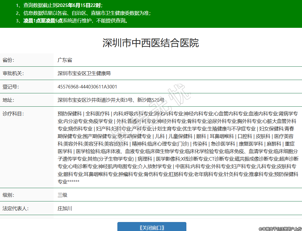 省份:廣東省審批機關:深圳市寶安區(qū)衛(wèi)生健康局登記號:45576968-444030611A3001地址:深圳市寶安區(qū)沙井街道沙井大街3號、新沙路528號診療科目:預防保健科 | 全科醫(yī)療科 | 內(nèi)科;呼吸內(nèi)科專業(yè);消化內(nèi)科專業(yè);神經(jīng)內(nèi)科專業(yè);心血管內(nèi)科專業(yè);血液內(nèi)科專業(yè);腎病學專業(yè);內(nèi)分泌專業(yè);免疫學專業(yè) | 外科;普通外科專業(yè);神經(jīng)外科專業(yè);骨科專業(yè);泌尿外科專業(yè);胸外科專業(yè);心臟大血管外科專業(yè);燒傷科專業(yè) | 婦產(chǎn)科;婦科專業(yè);產(chǎn)科專業(yè);計劃生育專業(yè);優(yōu)生學專業(yè);生殖健康與不孕癥專業(yè) | 婦女保健科;青春期保健專業(yè);圍產(chǎn)期保健專業(yè);更年期保健專業(yè) | 兒科 | 兒童保健科 | 眼科 | 耳鼻咽喉科 | 口腔科 | 皮膚科 | 醫(yī)療美容科;美容外科;美容牙科;美容皮膚科 | 精神科;臨床心理專業(yè)(門診) | 傳染科 | 急診醫(yī)學科 | 康復醫(yī)學科 | 麻醉科 | 重癥醫(yī)學科 | 醫(yī)學檢驗科;臨床體液、血液專業(yè);臨床微生物學專業(yè);臨床化學檢驗專業(yè);臨床免疫、血清學專業(yè);臨床細胞分子遺傳學專業(yè);其他(分子生物學專業(yè)) | 病理科 | 醫(yī)學影像科;X線診斷專業(yè);CT診斷專業(yè);磁共振成像診斷專業(yè);超聲診斷專業(yè);心電診斷專業(yè);神經(jīng)肌肉電圖專業(yè);介入放射學專業(yè) | 中醫(yī)科;內(nèi)科專業(yè);外科專業(yè);婦產(chǎn)科專業(yè);兒科專業(yè);皮膚科專業(yè);眼科專業(yè);耳鼻咽喉科專業(yè);腫瘤科專業(yè);骨傷科專業(yè);肛腸科專業(yè);老年病科專業(yè);針灸科專業(yè);推拿科專業(yè);預防保健科專業(yè)******級別:三級法定代表人:莊加川主要負責人:***執(zhí)業(yè)許可證有效期:2020/03/31 -至- 2035/03/30 -